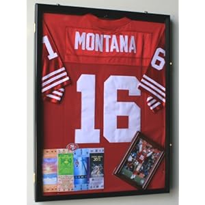Product Description : Handcrafted in solid furniture grade beech hardwood cabinet of beautiful design and construction. A glass door keeps inquisitive fingers away, as well as dust! Black pinnable fabric background to create a stunning display. Large fine hardwoord display case for football jersey, basketball jersey, baseball jersey, hockey jersey, or any other sport jerseys, uniforms, or other collectibles. Brass hinges and door latches. Matching hardwood hanger for hanging jersey inside. Mounting wall hardwares for hanging display vertically or horizontally are also provided. Brand new, comes with everything you need to put it on to display. Outside dimensions: 31 in. high, 23 in. wide, 2 1/4 in. deep., insideside dimensions: 30 in. high, 22 in. wide, 1 1/2 in. deep. (jersey, picture frame, and other items displayed on photo are not included) This cabinet has an installed UV Protection Rated Acrylic Door.