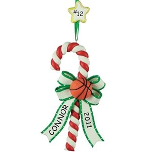 Product Description : Candy cane with green and white bow with a basketball in the center. Personalizing Suggestions: Name on one side, School or saying on other side, year on top