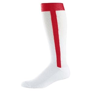 Product Description : 43% polyester/35% cotton/16% acrylic/6% elasticKnee-length two-in-one stirrup sockWhite sock with color stripe knitted-inCushioned toe sole and heelAdult has knit-in heel and toeIntermediate and youth are tube socks.